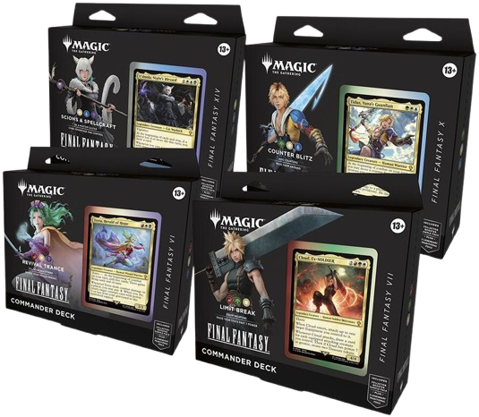 The entire FINAL FANTASY saga is here! Your players will step into the worlds of the beloved FINAL FANTASY RPG series' sixteen mainline games with a Commander deck mainly featuring cards from FINAL FANTASY VI, FINAL FANTASY VII, FINAL FANTASY X, and FINAL FANTASY XIV. They'll cast powerful spells, call upon classic summons, and even visit their favorite locations on the back of a Chocobo. Countless elements from the games are here for players to weave together their own stories.