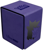 The Gengar Alcove Flip Box features a debossed character outline over a black foil silhouette on a premium leatherette material. These deck boxes hold up to 100 double-sleeved cards and the dual thumb notches make it easy to remove your cards when you are ready to battle. The flip lid is secured shut with several strong magnets, ensuring cards are protected when not in use.