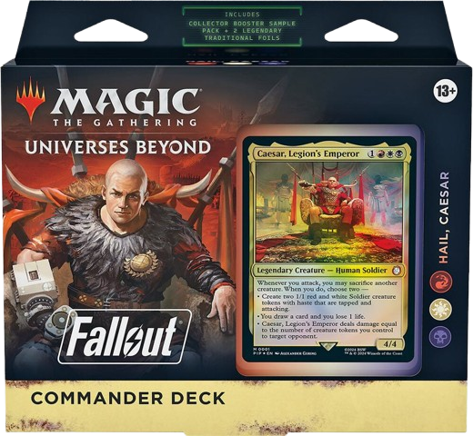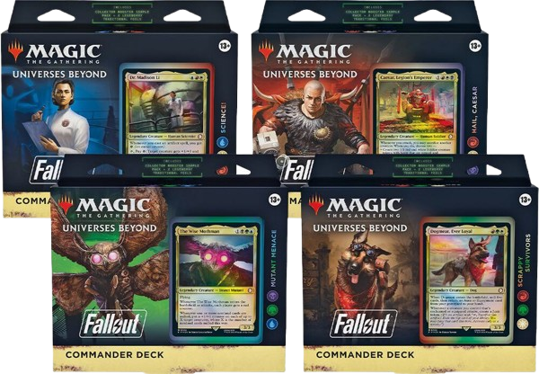 Battle your fellow wastelanders for survival as the Fallout series joins with Magic’s most popular multiplayer format. This set includes 4 Fallout Commander Decks—1 Hail Caesar (Red-White-Black deck), 1 Scrappy Survivors (Red-Green-White deck), 1 Science! (Blue-White-Red deck), and 1 Mutant Menace (Black-Green-Blue deck). Each deck set includes 1 ready-to-play deck of 100 Magic cards (2 Traditional Foil Legendary cards, 98 nonfoil cards), a Collector Booster Sample Pack (contains 2 Traditional Foil or nonfoil special treatment cards, with 1 Extended-Art card of rarity Rare or higher and 1 alt-art, alt-frame card of rarity Uncommon or higher), 1 foil-etched Display Commander (a thick cardstock copy of the commander card with foil etched into the card’s border and art), 10 double-sided tokens, 1 deck box (can hold 100 sleeved cards), 1 Life Wheel, 1 strategy insert, and 1 reference card.